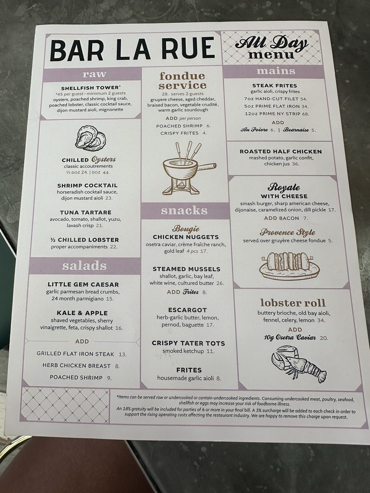 Welcome to Bar La Rue, a charming bar nestled at 820 W Fulton St in Chicago. This intimate space pairs French-inspired cuisine with a lively atmosphere, making it perfect for gatherings with friends or romantic outings. The menu offers delightful options like French Onion Soup, enriched with caramelized onions and gruyere, alongside the scrumptious Fondue Service featuring aged cheddar and creamy gruyere. For a touch of indulgence, the Frite Style Board serves generous chicken nuggets accompanied by a mountain of fries and mini martinis.
